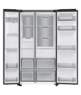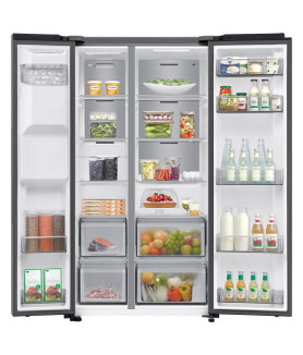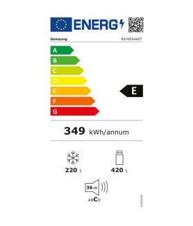 Réfrigérateur américain SAMSUNG RS70F64KET - D’une capacité totale de 640 L, dont 420 L pour la réfrigération et 220 L pour la congélation, ce modèle side by side combine un grand volume de stockage et une technologie de pointe - Grâce au froid ventilé intégral Multi-Flow, la température est homogène et stable dans toute la cavité, éliminant définitivement la corvée de dégivrage - Le panneau Metal Cooling en fond de cavité conserve le froid et le restitue efficacement à chaque ouverture - Le compresseur AI Inverter ajuste son fonctionnement selon les habitudes d’utilisation pour plus d’économies d’énergie et de silence (36 dB) - Compatible Wi-Fi via l’application SmartThings™, ce réfrigérateur permet un pilotage à distance et l’activation du mode AI Energy pour réduire jusqu’à 10% la consommation annuelle - Côté réfrigérateur : 4 clayettes en verre trempé, 5 balconnets de contre-porte, 2 tiroirs à légumes, bac à œufs, éclairage LED et fonction de réfrigération rapide - Côté congélateur : 4 clayettes, 2 tiroirs, 2 balconnets, fabrique de glace intégrée dans la porte, congélation rapide et éclairage LED - Pose libre, il mesure 178,4 cm de haut, 91,2 cm de large et 72,6 cm de profondeur - Sa finition Platinum Inox et sa classe énergétique E en font un modèle aussi élégant que performant.