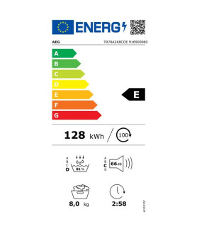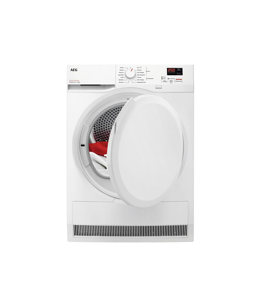 Sèche-linge pompe à chaleur AEG TR70A2K8COE Série 7000 - Grâce à la technologie SensiDry®, vos vêtements sont séchés uniformément à basse température, sans altérer les fibres, tout en conservant leur aspect neuf plus longtemps - La capacité de 8 kg est idéale pour les familles et permet de traiter efficacement des charges importantes - Équipé d’un système de pompe à chaleur, il réduit la consommation d’énergie tout en garantissant un séchage optimal - La technologie PreciseDry ajuste automatiquement le temps de séchage et la consommation d’énergie en fonction du poids de la charge, pour plus d’économies - Le programme MixDry permet de sécher simultanément des textiles en coton et en synthétique sans les trier - Profitez de la fonction Anti-froissage pour réduire les plis grâce à une rotation alternée, facilitant le repassage - Le filtre EcoFlow assure une efficacité énergétique constante et un nettoyage simple - Son bac de récupération d’eau de 5,32 L est facilement accessible, et sa porte réversible s’adapte à toutes les configurations de salle de bain ou buanderie - Ce modèle affiche un niveau sonore réduit de 66 dB(A), idéal pour un fonctionnement discret - L’interface LED permet un contrôle intuitif avec affichage du temps restant et départ différé.